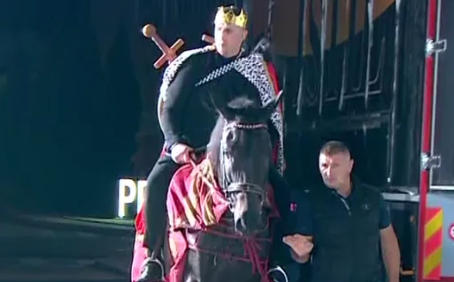 Kristijan je odlučio da na spektakularan način da uđe u studio, te je ušao kao vitez na konju sa krunom na glavii i štitom u ruci.