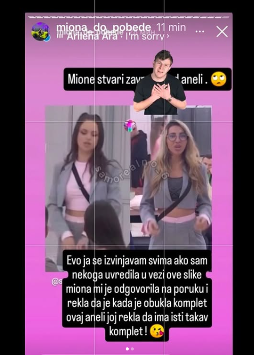 – Evo ja se izvinjavam svima ako sam nekog uvredial u vezi ove slike. Miona mi je odgovorila na poruku i rekla da je kada je obukla komplet ovaj, Aneli joj rekla da ima isti takav komplet – stoji u obavetešnju.