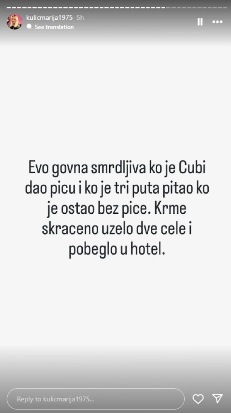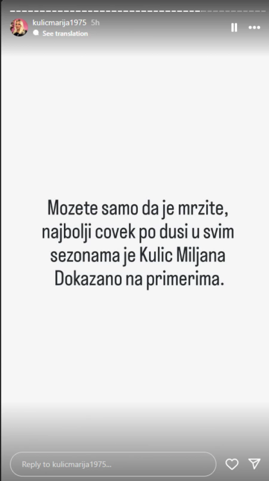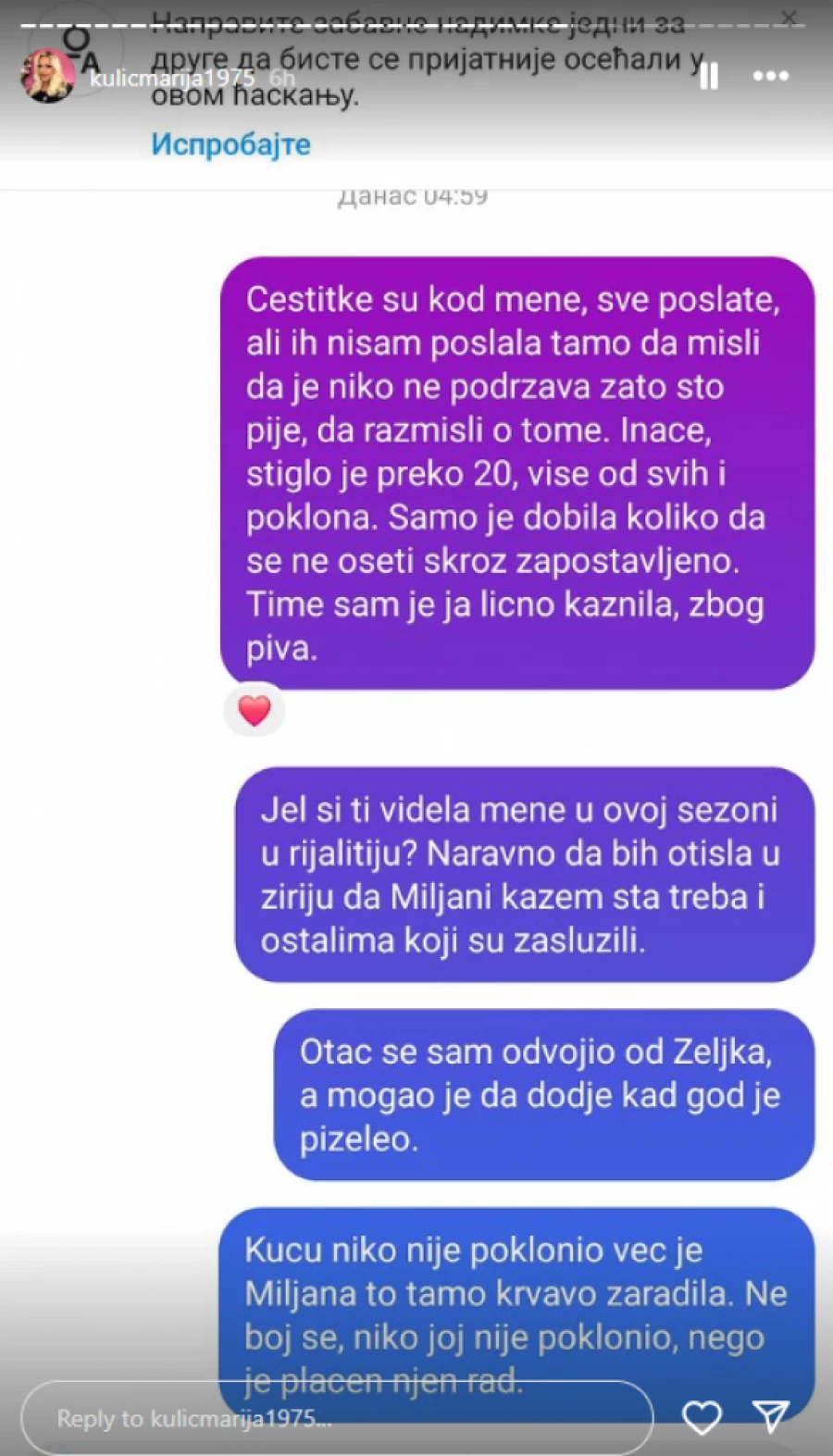 – Ne znam šta da ti kažem. Narod traži njenu diskvalifikaciju. Niti jedan pozitivan komentar, sve sama sebi radi loše. Šta je uradila ako opet sad izađe? Treba joj odmor od ovog rijalitija. To su proklete pare – napisala je jedna osoba, a Marija je odgovorila: