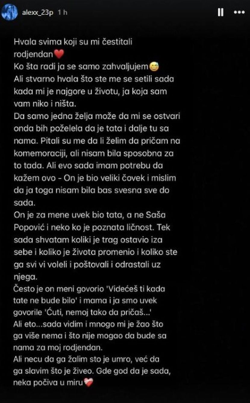 – Hvala svima koji su mi čestitali rođendan. Ko šta radi, ja se samo zahvaljujem. Ali stvarno, hvala što ste me se setili sada kada mi je najgore u životu, ja koja sam vam niko i ništa – započela je emotivnu objavu, dodajući da bi poželela da je njen otac, Saša Popović, i dalje sa njom i porodicom.