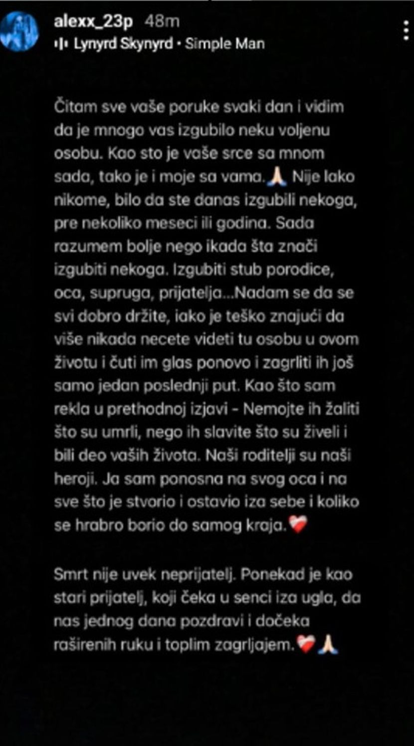 – Izgubiti stub porodice, oca, supruga, prijatelja…. Nadam se da se svi dobro držite iako je teško, znajući da više nikada nećete videti tu osobu u ovom životu i čuti im glas ponovo i zagrliti ih još samo jedan, poslednji put. Kao što sam rekla u prethodnoj izjavi – Nemojte ih žaliti što su umrli, nego ih slavite što su živeli i bili deo vaših života. Naši roditelji su naši heroji. Ja sam ponosna na svog oca i na sve šti je stvorio i ostavio za sebe i koliko se hrabro borio do samog kraja – napisala je ona na Instagramu.