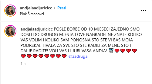 – Posle borbe od 10 meseci, zajedno smo došli do drugog mesta i ove nagrade! Ne znate koliko vas volim i koliko sam ponosna što ste vi baš moja podrška! Hvala za sve što ste radili za mene, što i dalje radite! Voli vas i ljubi vaša Andja – poručila je ona, te dodala emodži crvenog srca i srebrne medalje.