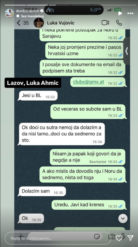 U prepisci jasno možete da videti da je Luka tražio Asminu da se nađu u Banjaluci da bi popričali, što je Durdžić shvatio da provokaciju. No, samo nekoliko sati kasnije Asmin je na Instagramu upravo objavio da je stigao u Banjaluku i da čeka Vujovića da stigne na suočavanje: