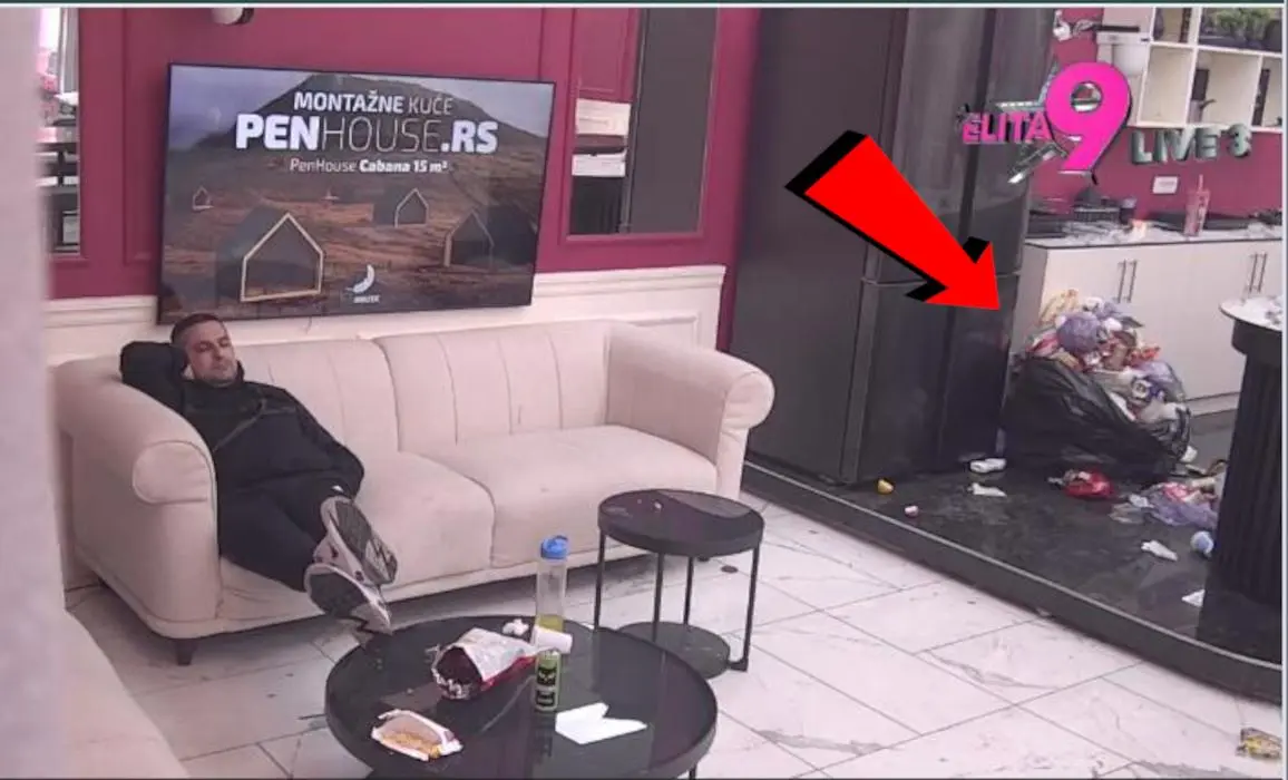 Na snimku iz Bele kuće vidi se Nenad Macanović Bebica kako sedi u dnevnom boravku, dok tik pored njega stoji ogromna kesa za đubre iz koje se smeće prosulo po celoj kuhinji. U kadru su vidljivi ostaci hrane, ambalaža i potpuni nered, kao da u kući vlada opšte zapuštanje, a ne slavska atmosfera.