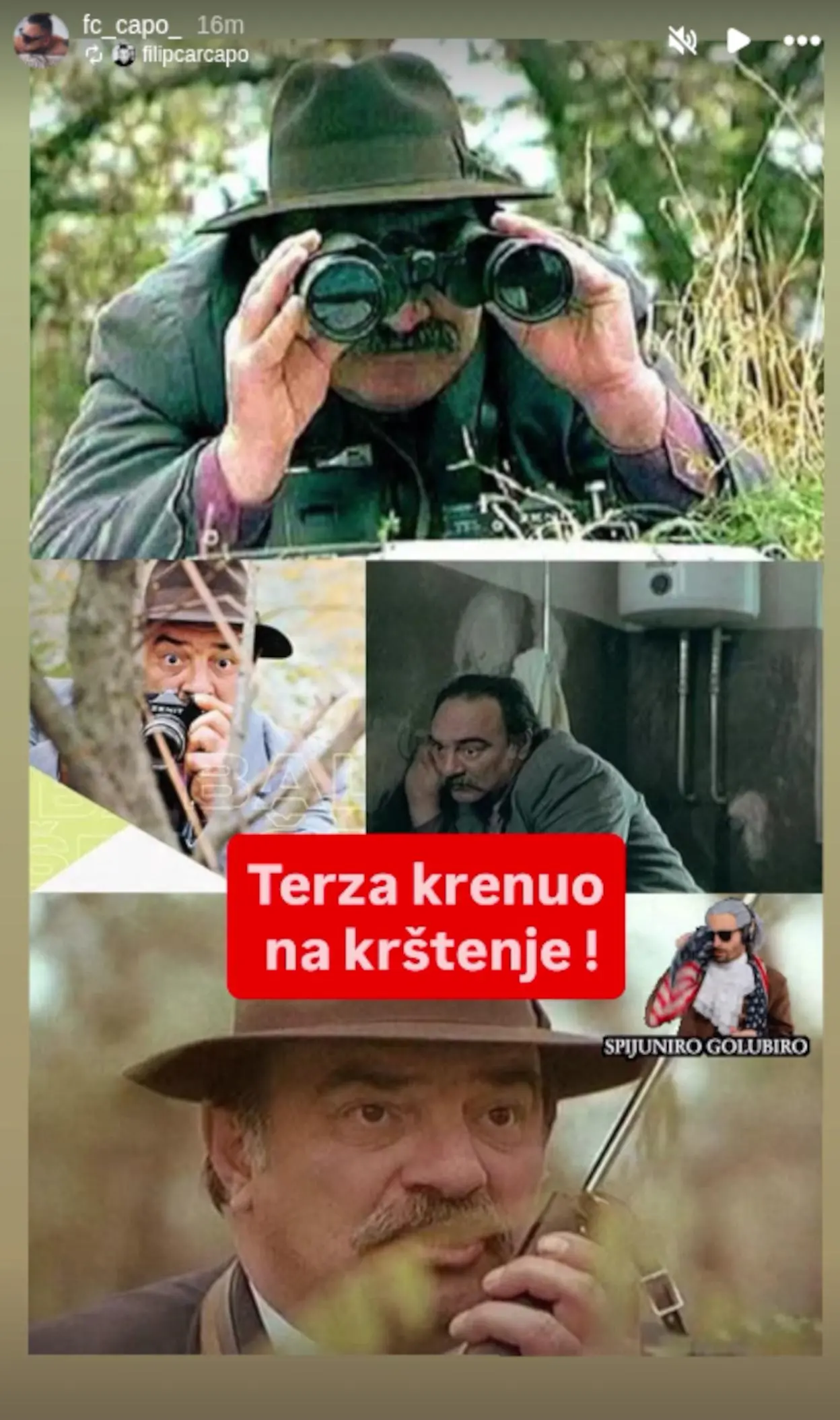 Filip je na svoj Instagram stori okačio fotografiju Ilije Čvorovića, lika kog glumi legendarni Danilo Bata Stojković u kultnom jugoslovenskom “Balkanskom špijunu”. Na isečcima Čvorović špijunira svog podstanara za kog misli da je strani špijun, kog glumi Bora Todorović.