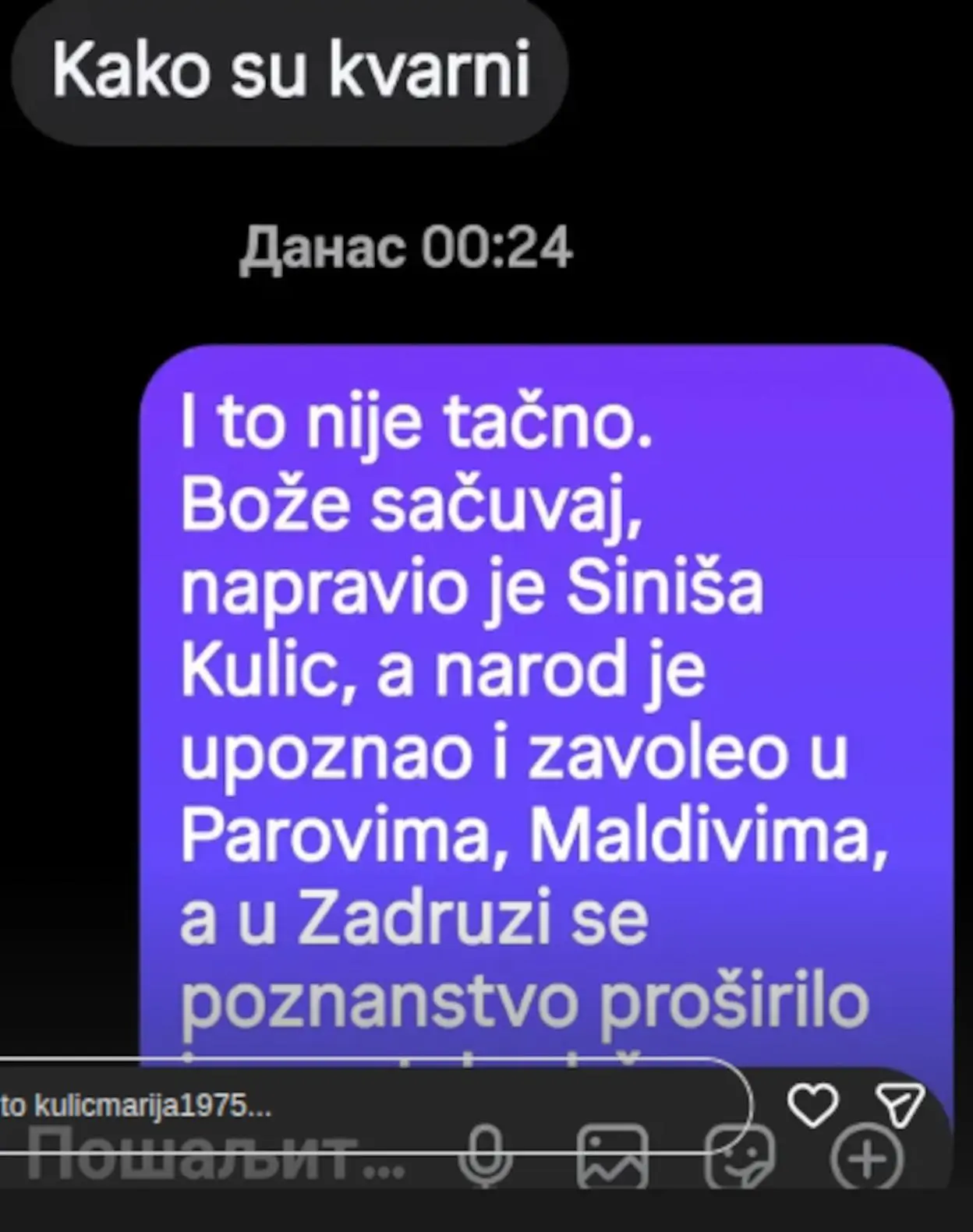 – I to nije tačno, Bože sačuvaj. Napravio je Siniša Kulić, a narod je upoznao i zavoleo u Parovima, Maldivima a u Zadruzi se poznanstvo proširilo – započela je marija, pa nastavila.