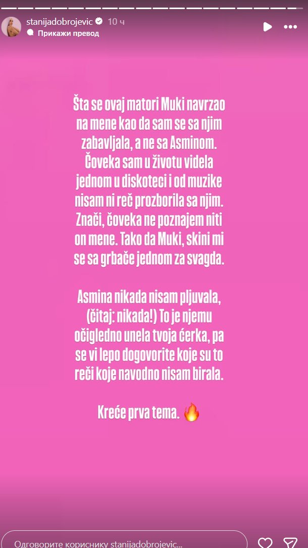 – Šta se ovaj matori Muki navrzao na mene, kao da sam se sa njim zabavljala, a ne sa Asminom. Čoveka sam u životu videla jednom u diskoteci i od muzike nisam ni reč prozborila sa njim. Znači, čoveka ne poznajem niti on mene. Tako da Muki, skini mi se sa grbače jednom za svagda. Asmina nikada nisam pljuvala (čitaj: nikada!). To je njemu očigledno unela tvoja ćerka, pa se vi lepo dogovorite koje su to reči koje navodno nisam birala.