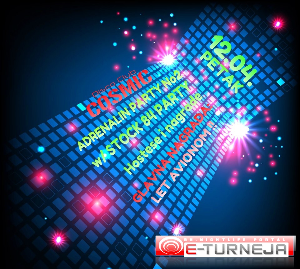 ADRENALIN PARTY No2 @ COSMIC (12.04) 06/04/2013 426 FacebookTwitterPinterestWhatsApp Klokotnica – Diskoteka COSMIC ADRENALIN PARTY No2 w/ Stock 84 party Hostese i nagrade Glavna nagrada: LET AVIONOM Ulaz: 1KM