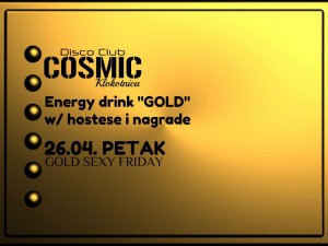 Gold Sexy Friday @ Diskoteka Cosmic (26.04) 22/04/2013 460 FacebookTwitterPinterestWhatsApp Diskoteka Cosmic – 26.04 (Petak) Promocija ENERGY DRINK “GOLD” w/ Hostese i nagrade GOLD SEXY FRIDAY – DISKOTEKA COSMIC
