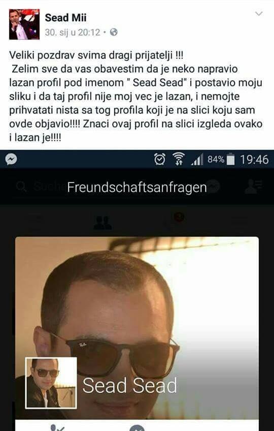„Veliki pozdrav svima dragi prijatelji! Želim sve da Vas obavestim da je neko napravio lažan profil pod imenom ” Sead Sead” i postavio moju sliku i da taj profil nije moj već je lazan i nemojte prihvatati ništa sa tog profila koji je na slici koju sam ovdje objavio! Znači ovaj profil na slici izgleda ovako i lažan je“-napisao je Sead.
