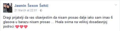 Jasmin Šehić iz Brčkog na snimanju trećeg kruga Zvezda Granda nije uspio proći u naredni krug. Iako je imao šest glasova žirija to po svemu sudeći nije bilo dovoljno da ovaj talentovani pjevač prođe dalje.