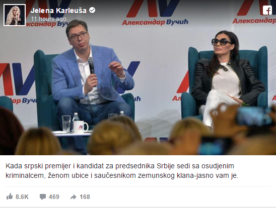 Plavokosa pjevačica je na svom Facebooku postavila fotografiju Vučića i Ražnatoviće i pored nje napisala: “Kada srpski premijer i kandidat za predsjednika Srbije sjedi sa osuđenim kriminalcem, ženom ubice i saučesnikom zemunskog klana-jasno vam je”.‬