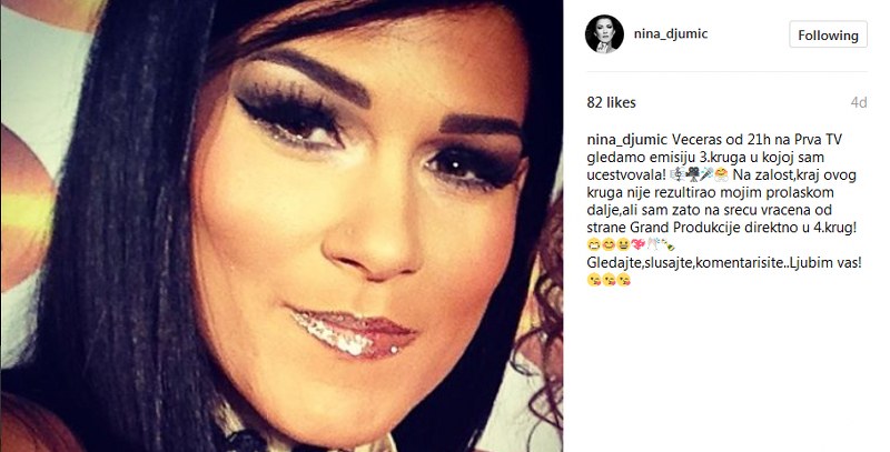“Nažalost, kraj trećeg kruga nije rezultirao mojim prolaskom dalje, ali sam zato na sreću vraćena od strane Grand Produkcije direktno u 4. krug”, napisala je Nina na svom Instagram profilu.