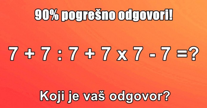 90% LJUDI POGREŠNO ODGOVORI: Koji je vaš odgovor? 21/08/2017 270 FacebookTwitterPinterestWhatsApp Pripremili smo vam zanimljivu matematičku zagonetku, na koju preko 90% ljudi odgovori pogrešno. Detaljno pogledajte zadatak, i napišite nam tačan odgovor…