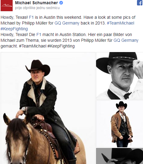 Dodatno ogorčenje izazvao je postupak porodice koja je na službenoj stranici velikana Formule 1 objavila fotografije Mihaela snimljene 2013. godine uoči nesreće. Šumaher je pozirao za jedan čuveni makazin u kaubojskom šeširu i kožnoj jakni.