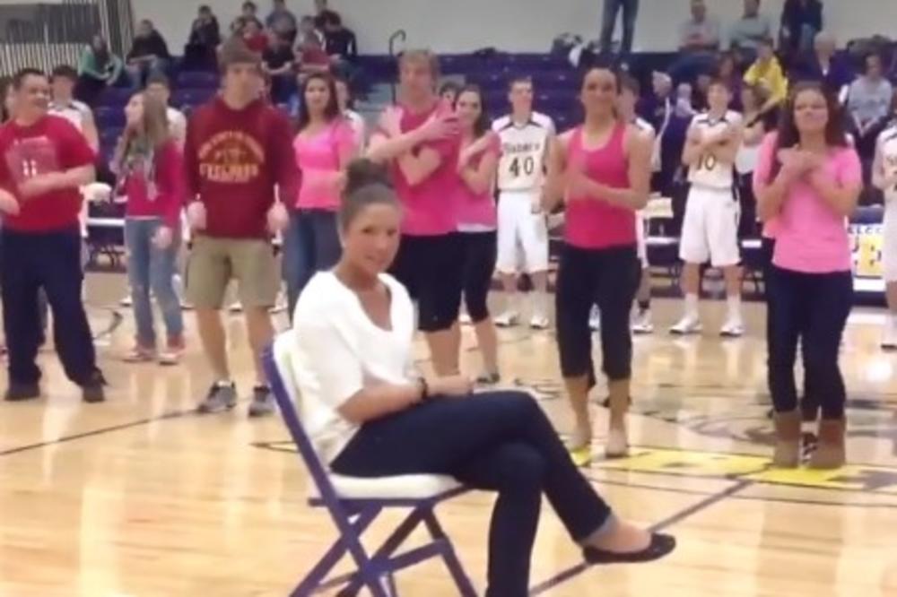 Hanu je njen dečko koji je trener košarkaškog tima u školi nagovorio da sedne nasred terena, jer je spremio specijalno iznenađenje za nju.