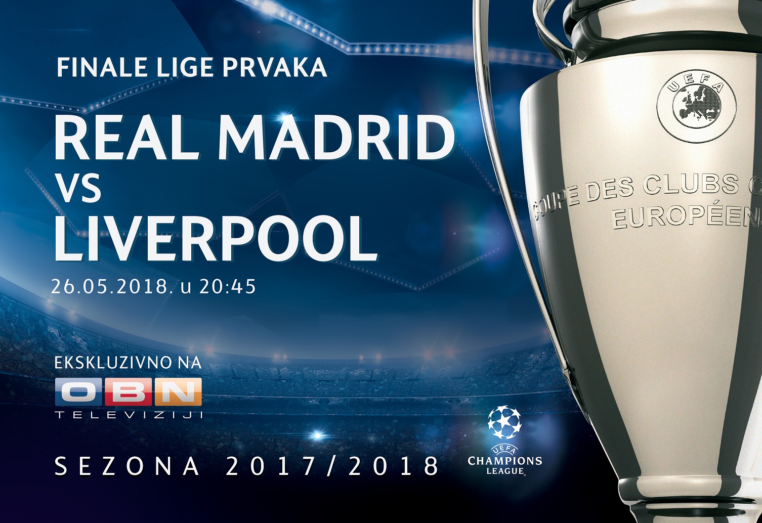 Večeras od 21 sat odigrat će se najiščekivanija utakmica ove sezone, finale Lige prvaka. OBN TV će izravno prenositi meč iz Kijeva, sa Olimpijskoh stadiona kapaciteta 70.050 mjesta. Snage će odmjeriti dvostruki uzastopni prvak Europe Real Madrid i engleski div Liverpool.