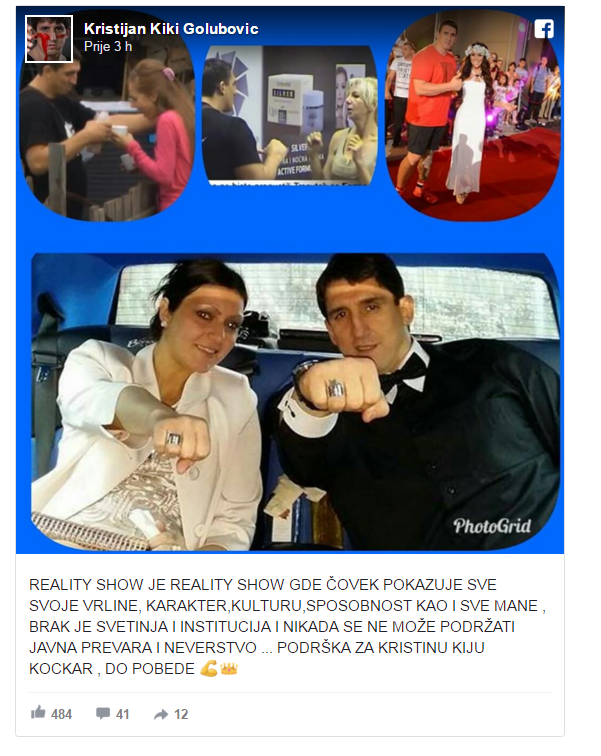 “Rijaliti šou je rijaliti šou gde čovek pokazuje sve svoje vrline, karakter, kulturu, sposobnost, kao i sve mane. Brak je svetinja i institucija i nikada se ne može podržati javna prevara i neverstvo… Podrška za Kristinu Kiju Kockar. Do pobede”, napisao je Kristijan na društvenoj mreži Fejsbuk.