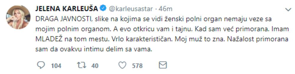 “Draga javnosti, slike na kojima se vidi ženski polni organ nemaju veze sa mojim polnim organom. A evo otkiću vam i tajnu. Kad sam već primorana. Imam mladež na tom mestu. Vrlo karakterističan. Moj muž to zna. Nažalost, primorana sam da ovakvu intimu delim sa vama”, napisala je Karleuša.