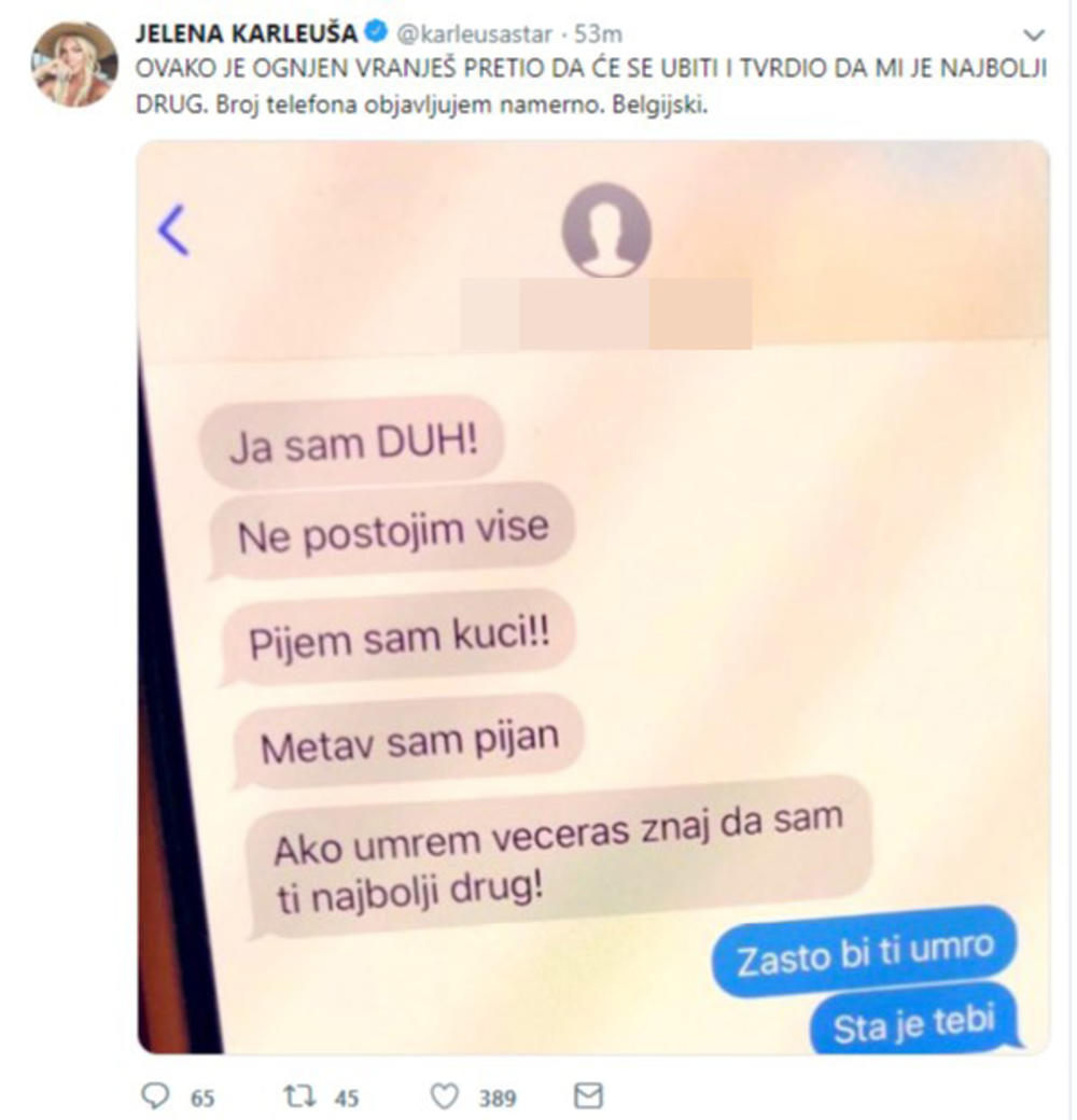 “Ovako je Ognjen Vranješ pretio da će se ubiti i tvrdio da mi je najbolji drug. Broj telefona objavljujem namerno. Belgijski”, napisala je pevačica na svom Tviter nalogu.