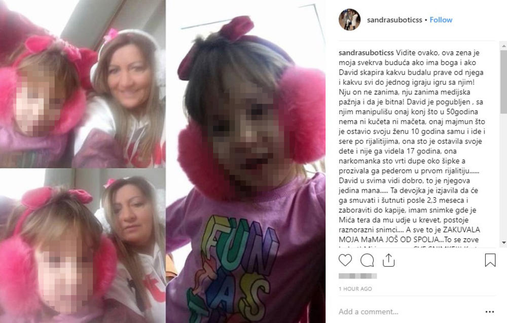 “Vidite ovako, ova žena (Biljana Dragojević) je moja svekrva buduća ako ima Boga i ako David skapira kakvu budalu prave od njega i kakvu svi do jednog igraju igru sa njim! Nju on ne zanima, nju zanima medijska pažnja i da je bitna! David je pogubljen, sa njim manipulišu onaj konj što u 50 godina nema ni kučeta ni mačeta, onaj majmun što je ostavio svoju ženu 10 godina samu i ide i se.e po rijalitijima, ona što je ostavila svoje dete i nije ga videla 17 godina, ona narkomanka što vrti dupe oko šipke a prozivala ga pe.erom u prvom rijalitiju… David u svima vidi dobro, to je njegova jedina mana… Ta devojka je izjavila da će ga smuvati i šutnuti posle 2,3 meseca i zaboraviti do kapije, imam snimke gde je Mića tera da mu uđe u krevet, postoje raznorazni snimci… A sve to je zakuvala moja mama još od spolja… To se zove bolest! Mi imamo sve snimke! Ko to još podržava! Ja sam njegova VERENICA, ja sam osoba čije je on dete odgajao… Šta bude bice… Ali ja se idalje nadam da će on skapirati šta mu se radi… Ja njega volim i ta ljubav preko noći ne može da nestane! Kraj”, napisala je Aleksandra i objavila fotografiju buduće svekrve sa njenim detetom.