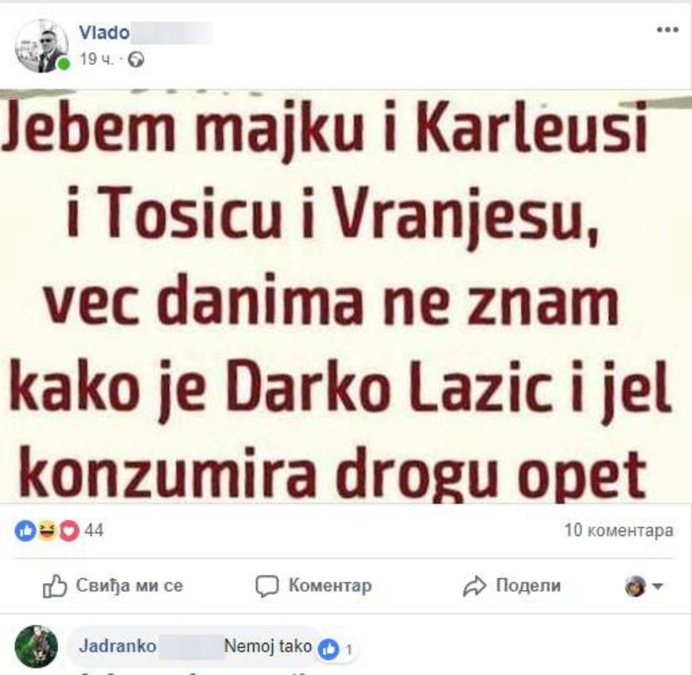 “Je*bem majku Jeleni, Tošiću i Vranješu! Već danima ne znam kako je Darko Lazić i da li se drogira!”.
