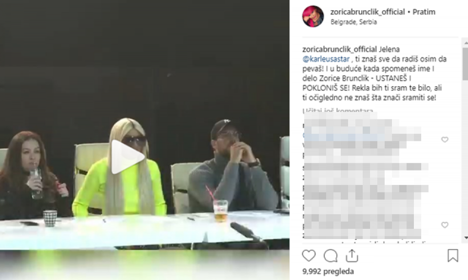 – Zašto to? Je l’ mogla još Marković? Da sada jako udarim glavom. Hoćeš Zoricu Brunclik? – rekla je Karleuša na snimku koja je objavila Zorica Brunclik.